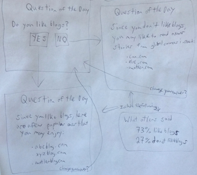 I came up with a ‘question of the day’ app for a simple example to use here. Depending on which out of the multiple choice answers the user selects, they’d see a different result. Here’s how I sketched it on paper: